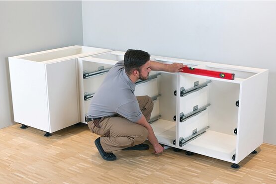 Az igazi megoldás az állítható műanyag lábakkal jött el. Ezekkel a bútorelemek készítése leegyszerűsödött és immáron normális szintezési lehetőség is elérhető volt. A szekrények alsó traktusának eltakarását az úgynevezett szokli tette lehetővé. Évekig boldogságban használtuk ezeket, de valami hiányzott. No, nem az a felfázás, amit a szekrények szintezése közben szenvedtünk el a hideg padlóburkolaton, miközben a vízmérték libelláját igyekeztünk jobb belátásra bírni. Hanem a kényelmes állítás, amikor pontosan tudjuk, hogy mit csinálunk és az egyből kézzel is fogható.