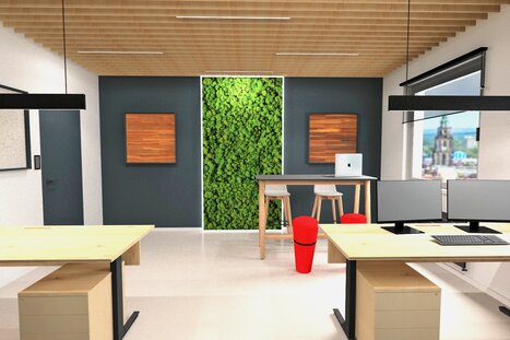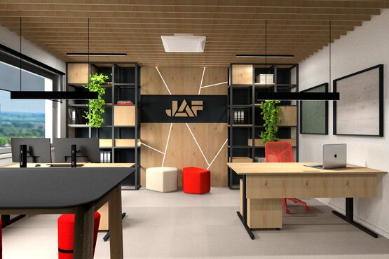 Az első nagyobb pályázat, amin már végzett tervezőként vettem részt, a JAF Holz Ungarn Kft. Iroda Design pályázata volt. A tervezés során a fő tendencia, hogy a két iroda designja egy egységes koncepcióra épüljön fel. A közös irányvonal lényege, hogy a berendezés és a kiegészítő tárgyak nagy része szintén a cég által forgalmazott termékekből, illetve nyersanyagokból készüljenek el. Ez költséghatékonyság, brand hűség, valamint a belső vállalati marketing szempontjából is hasznos megoldás lehet.