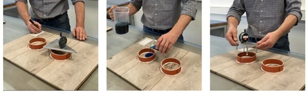 A teszt lényege, hogy a vizsgálandó laminált padló felületére két felülről nyitott hengert ragasztanak, majd 100 ml pigmentált vízzel feltöltve vizsgálják a felület deformálódását, szivárgását, elszíneződését és tömörségét 24 óra elteltével.