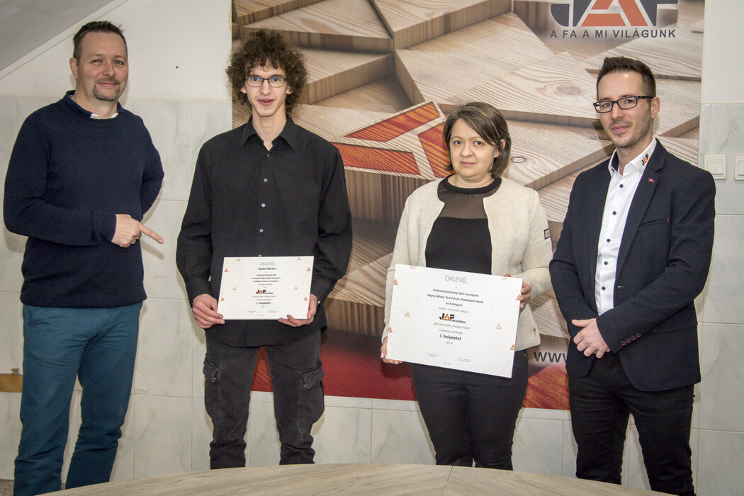 „Célunk, hogy az ilyen tehetségeket, mint Marci, fel tudjuk karolni és támogassuk őket abban, hogy a pályán maradjanak, a faipar a szenvedélyükké váljon, és minél szélesebb látókörrel rendelkezzenek, miután az iskolából kikerülnek. A versenyünk üzenete, hogy szeressék meg a szakmájukat, maradjanak meg benne és nyissanak a világra. A felajánlott gépeket igyekeztünk úgy összeválogatni, hogy egy kezdő asztalos az alapfeladatokat el tudja látni ezekkel – részletezte Föőr Róbert”, a JAF Holz szakmai trénere. Reméljük, hogy a diákok az értékes nyeremények mellett naprakész szakmai ismeretekkel gazdagodtak.
