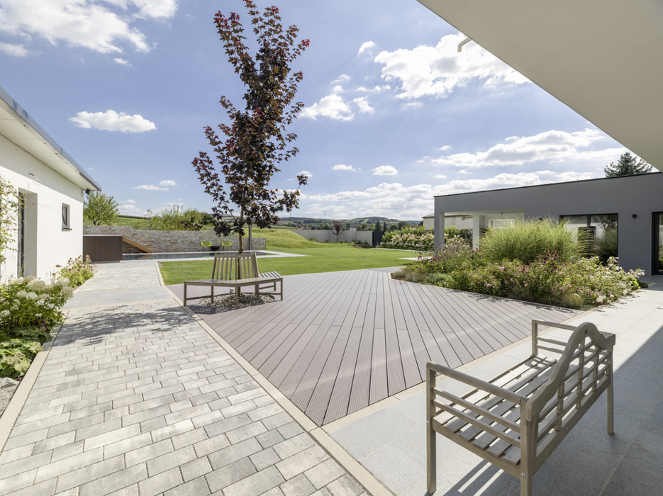 Kreatív ötletekkel és nagyszerű anyag- és formaérzékkel egy alsó-ausztriai család létrehozta személyes pihenő oázisát. A modern családi ház harmonikus környezetbe ágyazva, mely változatosságával lenyűgöz különféle teraszokkal, hangulatos „lugassal”, elegáns medencével, festői kiskerttel, játszótérrel és saját grillezővel. Az UPM ProFi® WPC burkolata „vezető szerepet” tölt be a teraszok felületén, amelyet mindkét teraszon, valamint a medence körül és a medence szerkezetében használtak. Az anyagot a JAF Stockerau szállította.