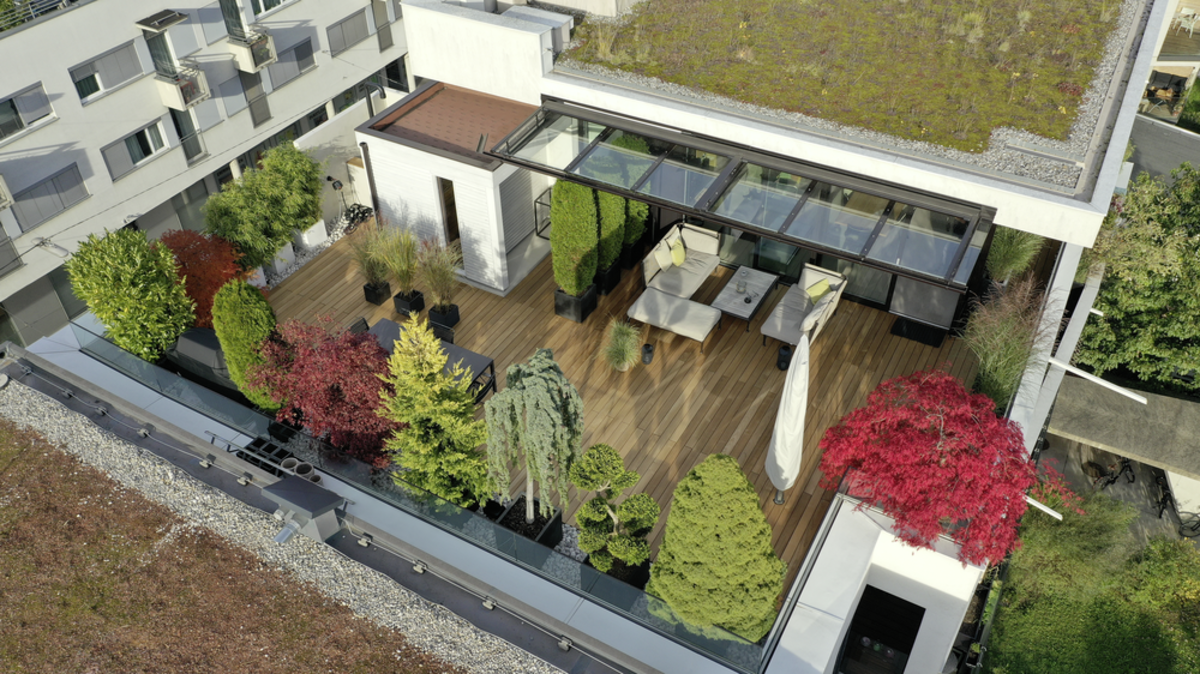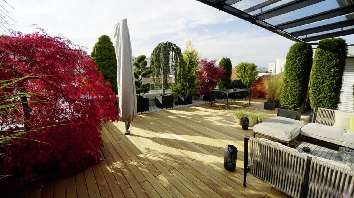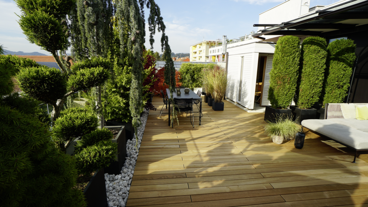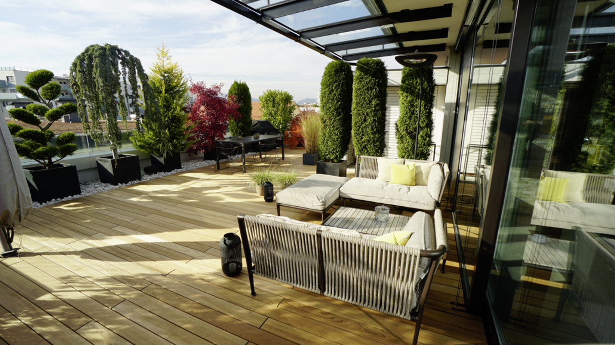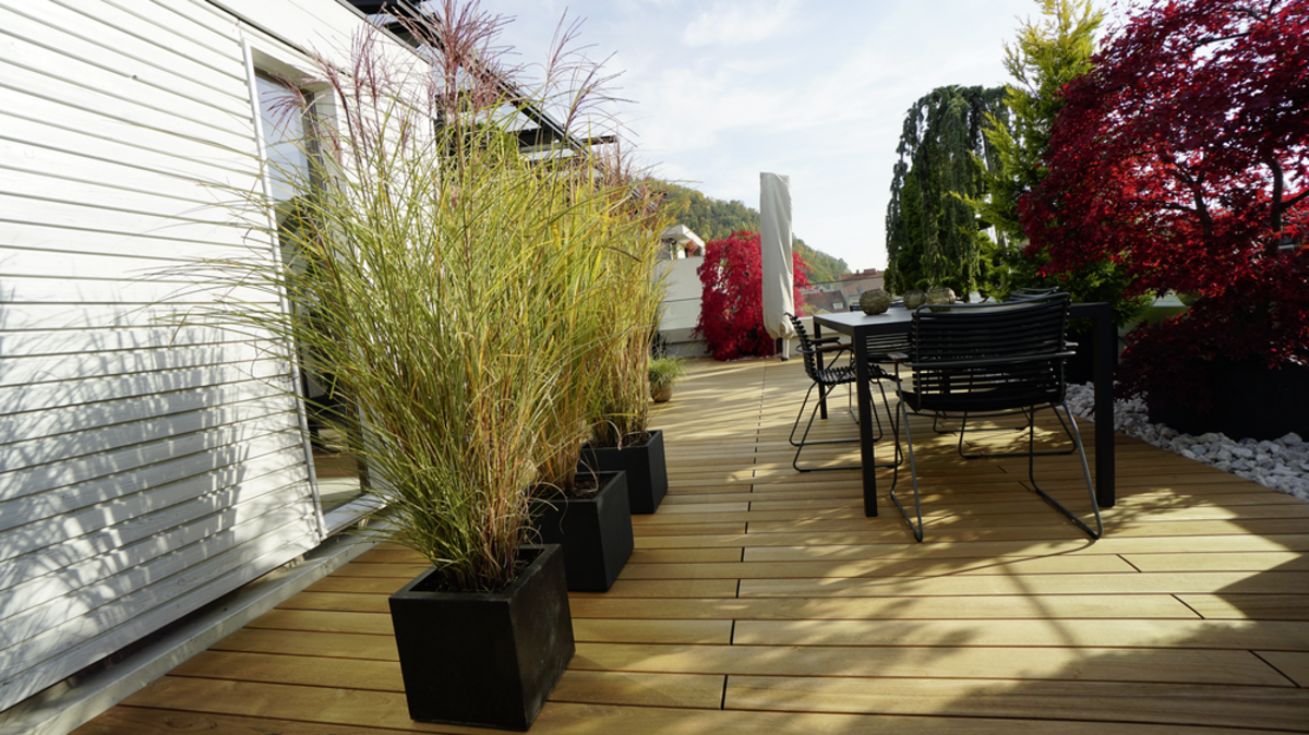 Csak egy kőhajításnyira a nyüzsgő városközponttól valósították meg a tulajdonosok álmukat, hogy madártávlatban éljenek. A nemes teakfából készült tetőterasz a jó közérzet oázisával egészíti ki az otthont, mely tiszta kikapcsolódást ígér. A lerakási rendszernek és a hozzáillő alépítménynek köszönhetően a deszkák gyorsan és szakszerűen kerültek lerakásra, így teremtve meg a terasz hosszan tartó élvezetének alapfeltételeit. A grazi JAF Zengerer kitűnő tanácsainak és szállításának köszönhetően a terasz még több pihentető órát biztosít a jó levegőjű magasságban.
