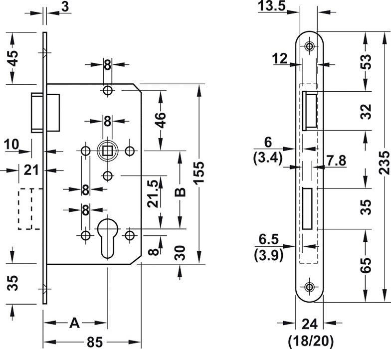 911.03.094 Häfele Acél Bevésőzár Nyílóajtókhoz PZ Tengelytávolság 55mm Előlap 20mm Jobb Ezüstszínű Lakkozott