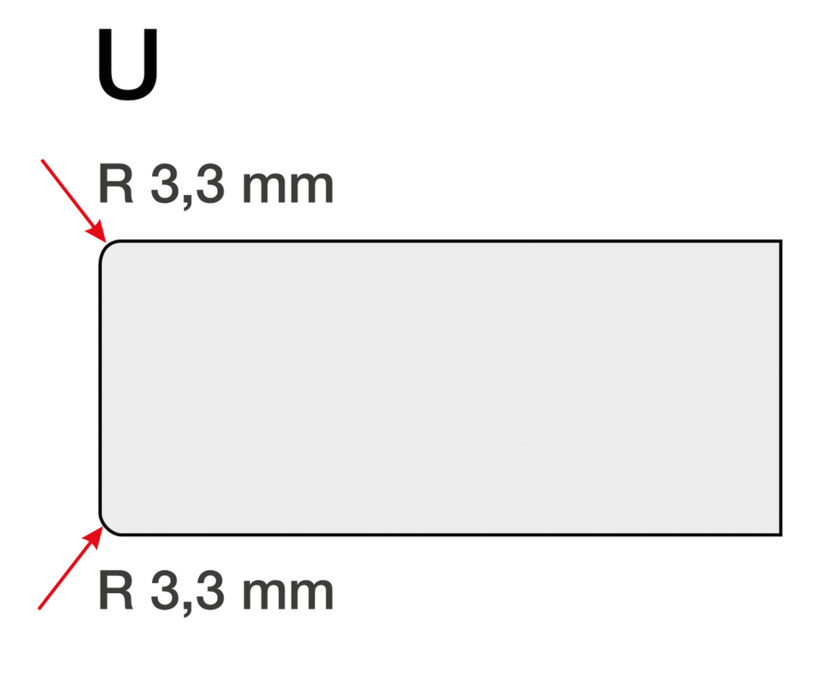 Alul- fölül kerekített él. Rádiusz: 3,3 mm