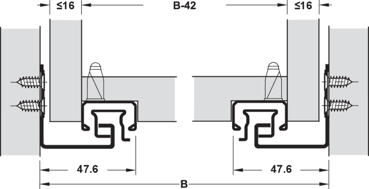 Méret: max. fiókszélesség SB = belső korpusszélesség - 41 mm + 2 x fiókoldal vastagság