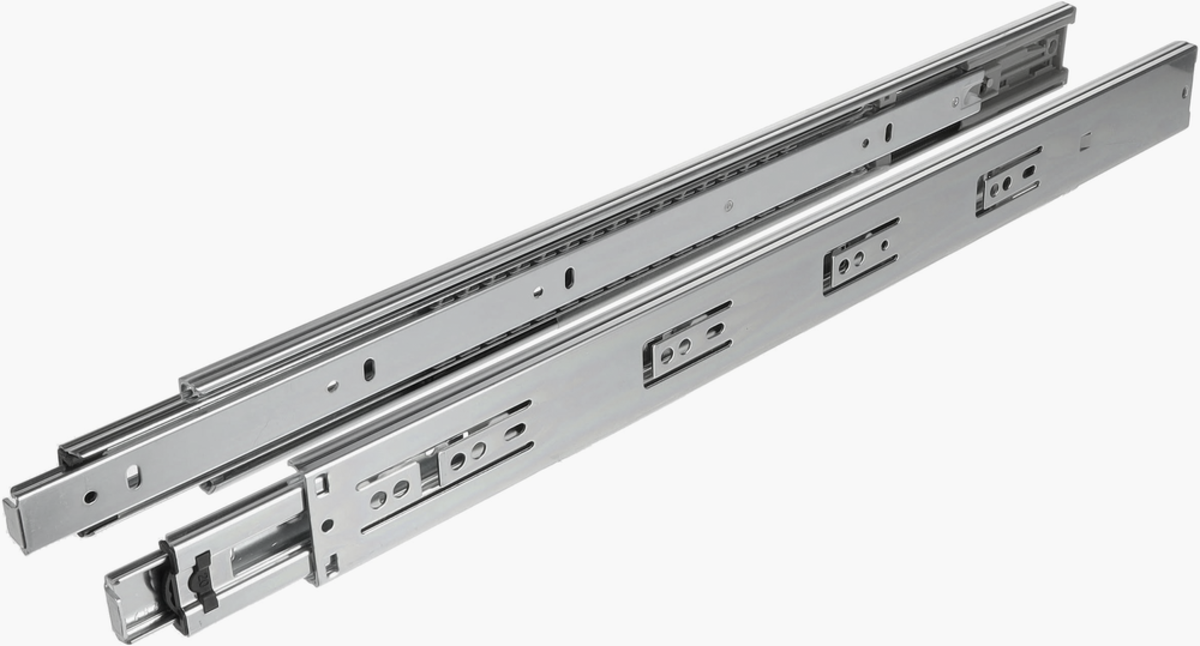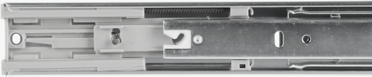 45 mm magas, golyóscsapágyazás épített fa fiókokhoz, teljes kihúzással. Masszív fióksín 1,2, 1,2 és 1,5 mm-es anyagvastagságok. A fiók lágy zárású mechanizmussal van felszerelve, zárórugóval és olajcsillapítóval a lassú záráshoz.