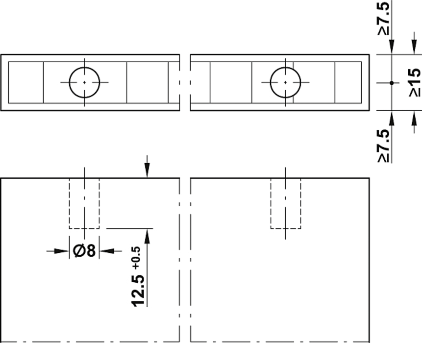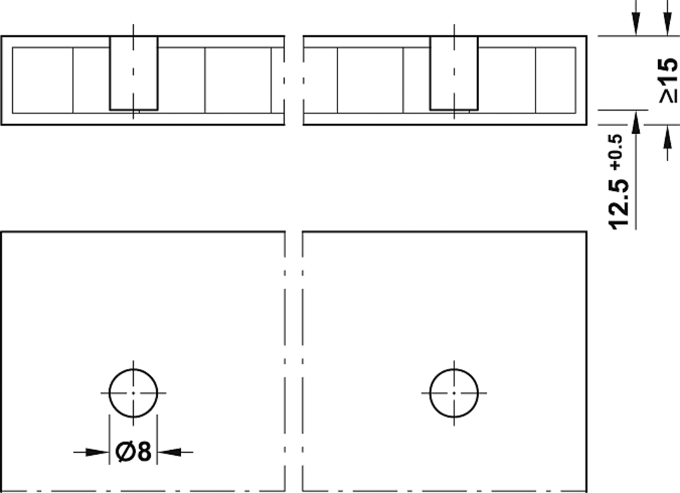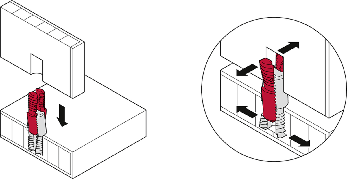 Rejtett, nem oldható kötésű korpuszösszehúzó, kisbútorokhoz, fiókokhoz. MDF és faforgácslapokhoz 15mm-vastagságtól. 8mm-es furatban történő szerszám nélküli bepréseléshez, ragasztó opcionális.