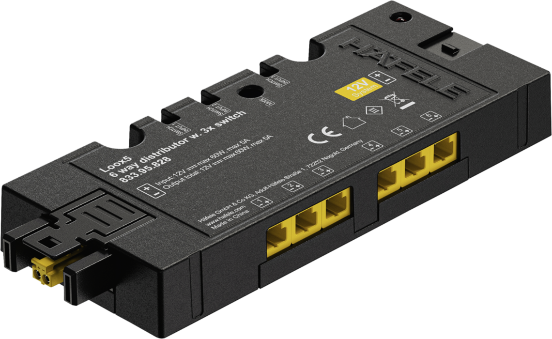 Häfele elosztó Loox5 6 utas, doboztól dobozig kapcsoló funkcióval 3 kapcsolóhoz, 12V 833.95.828